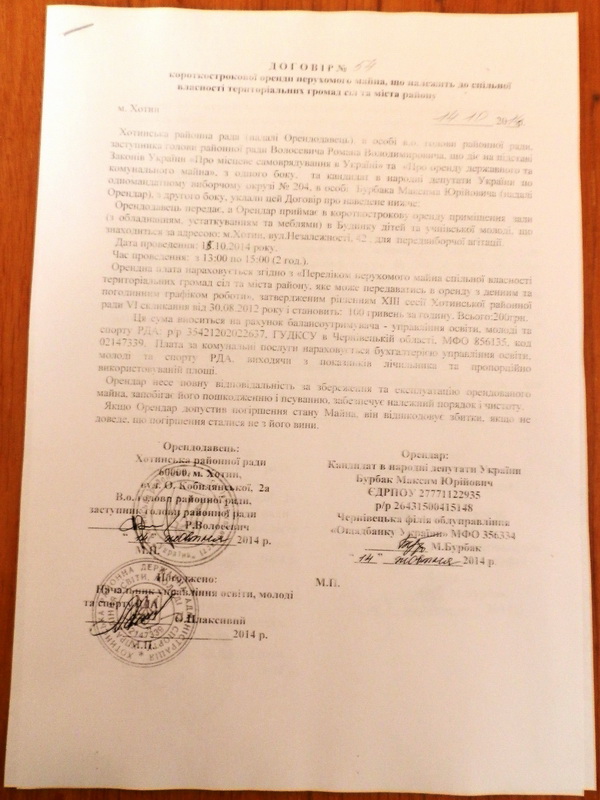 15 жовтня в місті Хотин (204 виборчий округ, Чернівецька область) відбулася зустріч з виборцями кандидата-мажоритарника в цьому окрузі від Народного фронту, міністра інфраструктури Максима Бурбака. Його приїхав підтримати Андрій Парубій (номер 4 у виборчому списку Народного фронту). Зустріч відбулася у приміщенні Будинку дітей та учнівської молоді міста Хотин, перед початком зустрічі з Максимом Бурбаком інший кандидат-самовисуванець в цьому ж виборчому окрузі Василь Забродський агітував проти свого опонента.