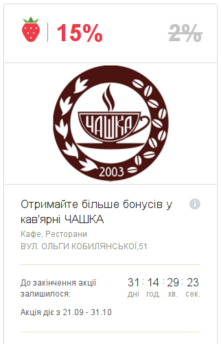 До 31 жовтня кафе “Чашка” даруватиме 15% бонусів кожному, хто зареєструється в акції Бонус Плюс і розрахується за смачну каву карткою ПриватБанку.