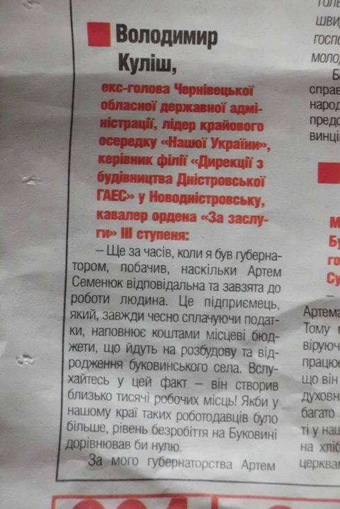 Йдеться, нагадаємо, коли на парламентських виборах 2012 року в одній з регіональних газет з'явилася підбірка коментарів про підтримку кандидата у депутати Артема Семенюка. Серед відомих буковинців, які висловилися "за" цього висуванця регіоналів, було також надруковано коментар Володимира Куліша.