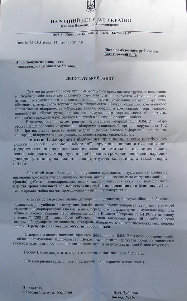 Голова підкомітету з питань книговидання та книгорозповсюдження Комітету Верховної Ради України з питань культури і духовності Володимир Зубанов звернувся з депутатським запитом "Про недопущення закриття книжкових магазинів в м. Чернівці" до віце-прем'єр-міністра України Р.В.Богатирьової. Копію запиту сьогодні роздавали під стінами ОДА під час Книжкового протесту проти закриття чернівецьких книгарень.