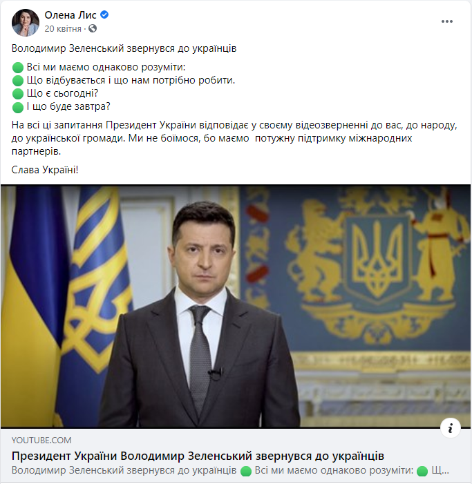 Олена Лис та Валерій Божик у квітні цього року поширювали звернення Президента Зеленського стосовно ситуації на Сході України.