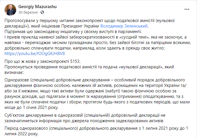 Для прикладу депутат від 203 округу Георгій Мазурашу наприкінці березня писав про підтримку законопроект щодо податкової амністії («нульової декларації»).