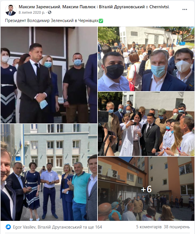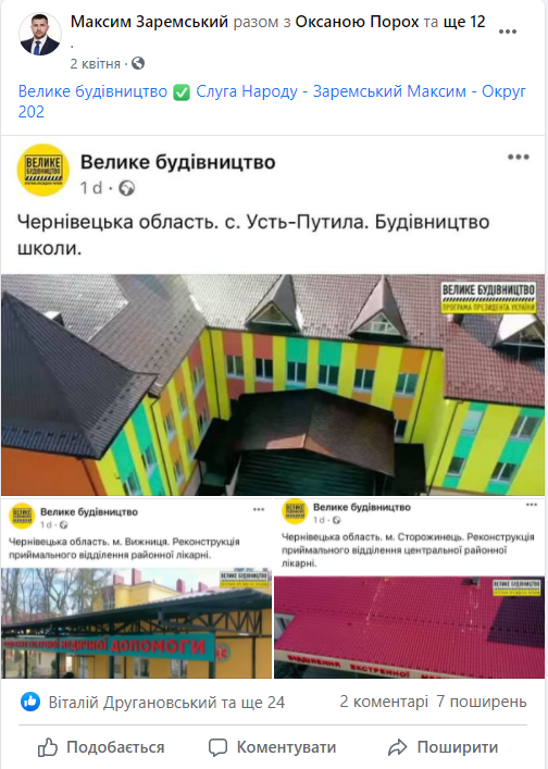 Доволі високу активність видно і на сторінці Максима Заремського, який поширює дописи президентської програми «Велике будівництво», а також пише про поїздки Президента на важливі міжнародні переговори.