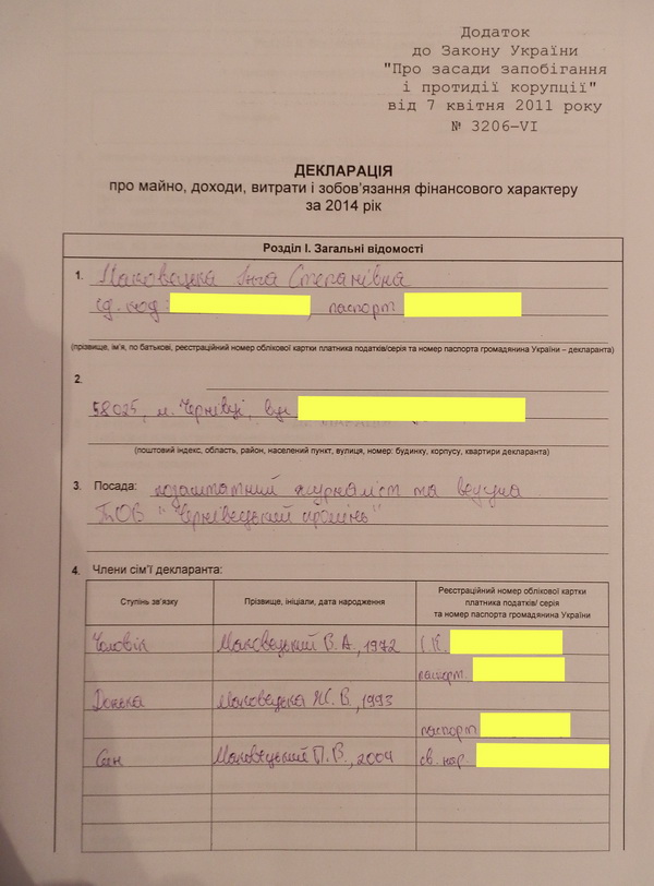 Декларація першого заступника голови Чернівецької обласної ради Інґи Маковецької за 2014 рік, коли вона працювала позаштатним журналістом телеканалу "Чернівецький промінь", який у Чернівцях пов'язують з підприэмцем, а нині депутатом Василем Проданом.
