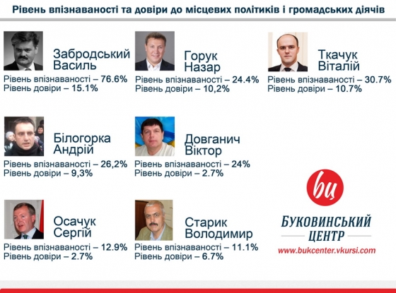Якщо так то гарна у нас , на Ваш погляд, збирається команда кандидатів у мери: один ніколи і не думав балотуватись на мерське крісло, іншого не знає навіть один відсоток Чернівчан, хтось з них не зміг перемогти у виборах навіть до місцевих рад , хтось пише заяву про вихід з ради, котру відкликав, шукач злочинців. І це при тому що вище Вами зазначених , в діаграмі , осїб ніяк не можна порівнювати з депутатом-співуном.