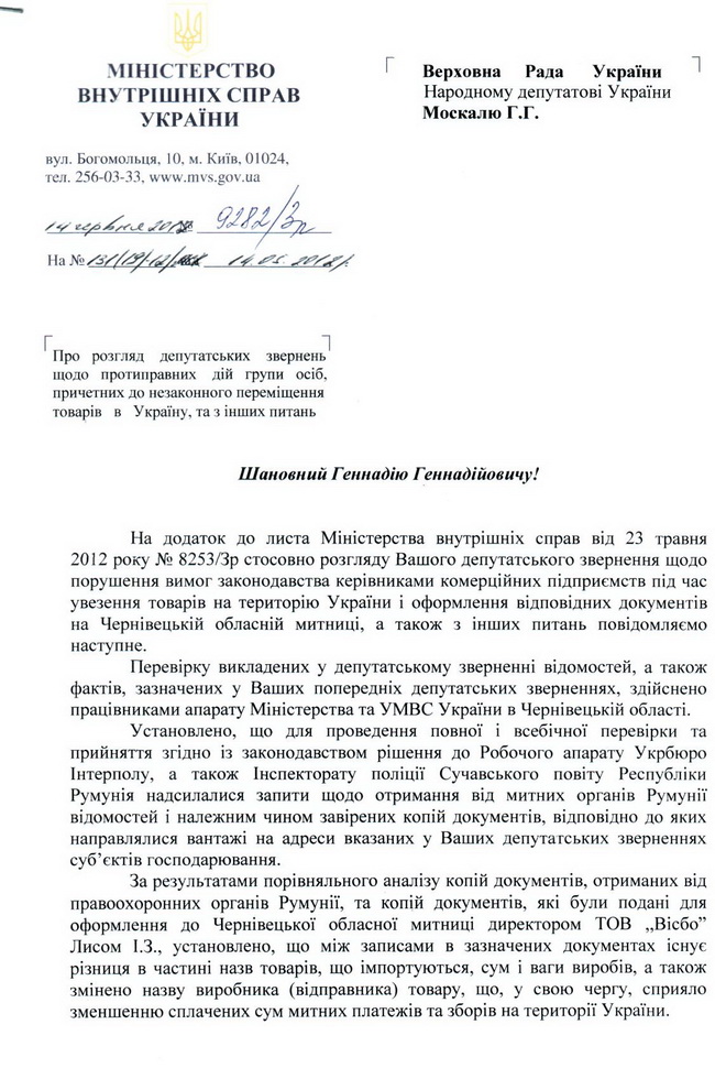 — Через півроку мого листування з МВС, Генпрокуратурою та Службою безпеки України щодо контрабандної діяльності, яка рясно квітне на Чернівецькій митниці, МВС нарешті почало “здаватися” і вживати адекватних заходів, — повідомляє народний депутат Геннадій Москаль. — Натомість Генеральна прокуратура й СБУ все ще тримають “міцну оборону” й діють за принципом — нічого не бачу, нічого не чую, нічого нікому не розкажу. Надаю текст останньої відповіді на моє депутатське звернення до міністра внутрішніх справ Віталія Захарченка.