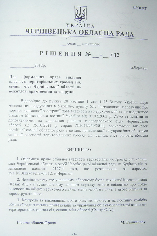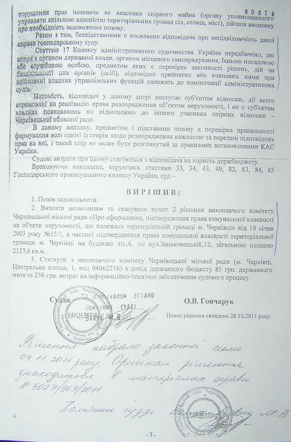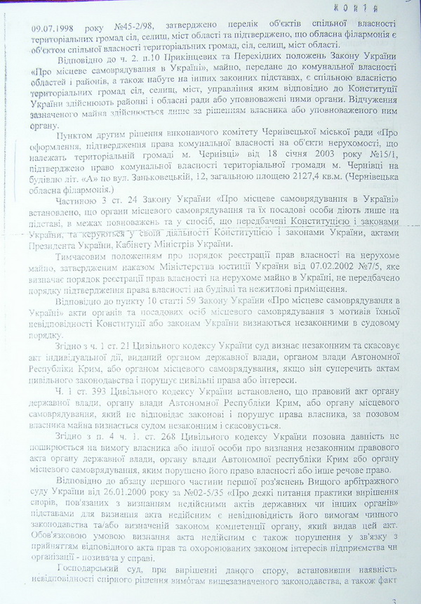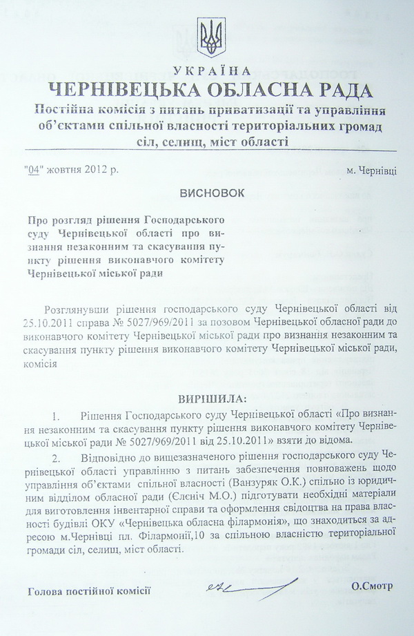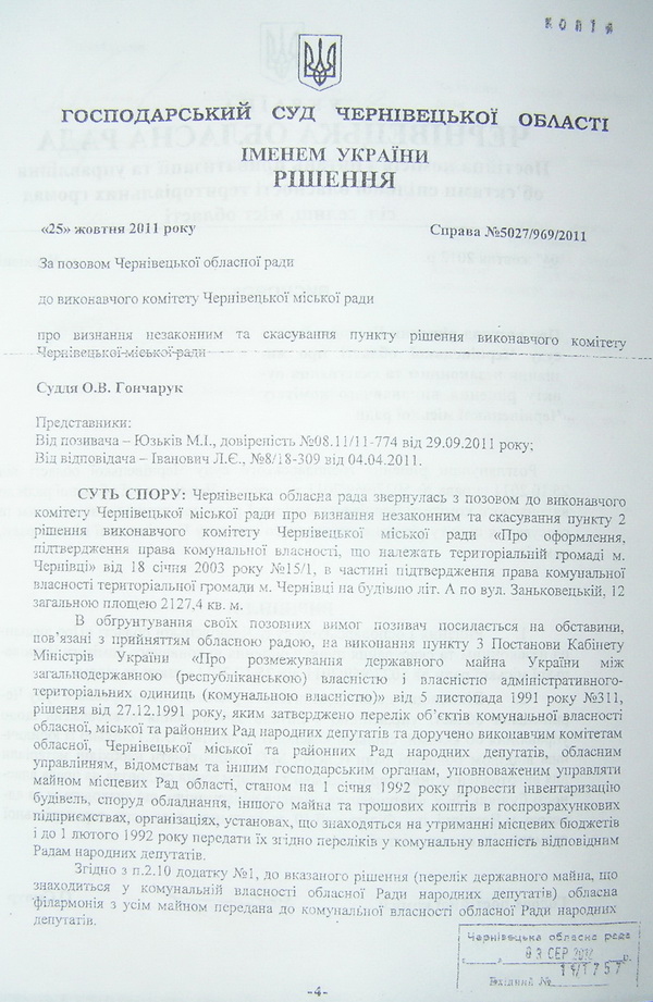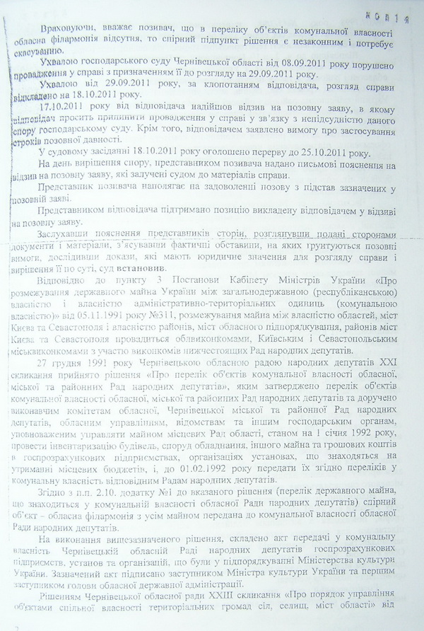 Йдеться про судовий позов Чернівецької обласної ради, представники якої раптом схаменулися і восени 2011 року зажадали визнати незаконним та скасувати пункт рішення виконкому Чернівецької міської ради, ухвалений більше дев’яти років тому. Про це повідомляє кореспондент www.buknews.com.ua. По-газдівськи прибираючи до рук все, що погано лежить, тодішній виконком міськради ще на початку 2003 року підтвердив право комунальної власності, що належить територіальній громаді м. Чернівці на будівлю обласної філармонії. Ледь не десятиліття по тому, обласна рада зажадала, щоб господарський суд Чернівецької області пункт 2 цього рішення виконкому № 15/1 від 18 січня 2003 року скасував. Застереження міської ради, що цю справу мав би розглядати суд адміністративний, а не господарський суддя О.Гончарук до уваги не взяв. Відтак 25 жовтня 2011 року виніс рішення, згідно з яким повернув спірне приміщення області. Чи оскаржувала це рішення суду влада міста в порядку апеляції наразі невідомо.