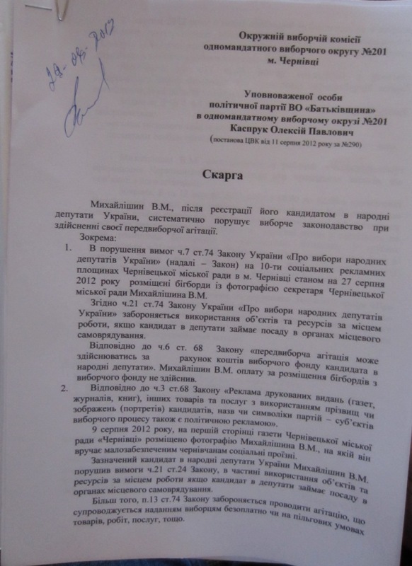 Також на першому засіданні було розглянуто скаргу уповноваженого ВО "Батьківщини" Каспрука щодо порушень чинного законодавства Михайлішиним. Зокрема, незаконне використання соціальних рекламних площ Чернівецької міської ради, використання об'єктів та ресурсів за місцем роботи в органах місцевого самоврядування (комунальної газети "Чернівці") і агітація з наданням виборцям безоплатно послуг, товарів тощо (видача соціальних квитків), використання приміщень міської ради для проведення агітації.