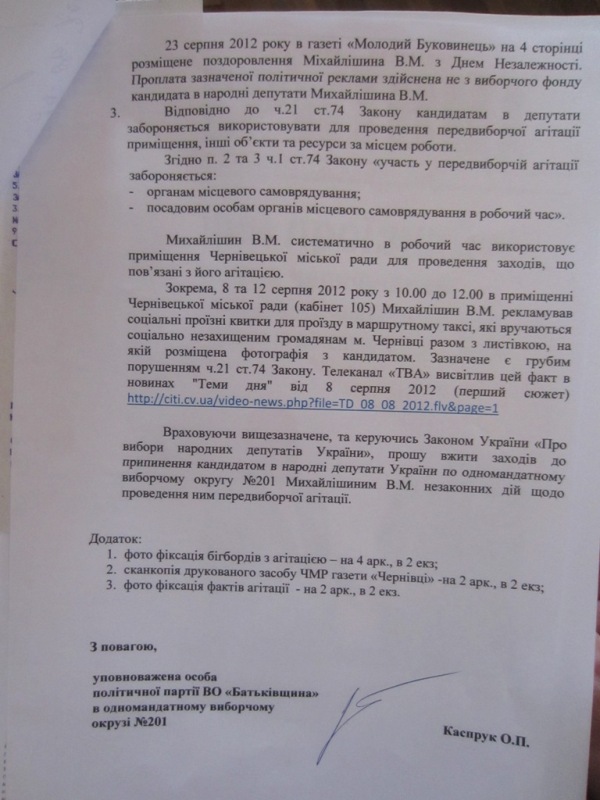 незаконне використання соціальних рекламних площин Чернівецької міськради для розміщення зображення кандидата в депутати Михайлішина (всупереч ч. 7 та ч.21 ст. 74, а також ч.6 ст. 68 Закону України «Про вибори народних депутатів України»);