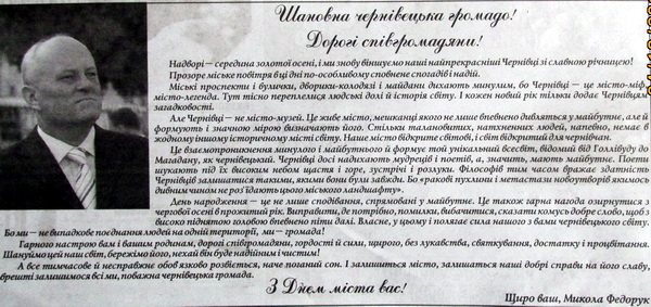 Чернівецький міський голова Микола Федорук - останній легітимний мер міста, а нині народний депутат України - привітав співгромадян з Днем міста. Федорук процитував Тараса Прохаська і натякнув, що все тимчасове й несправжнє обов'язково розвіється, наче поганий сон.