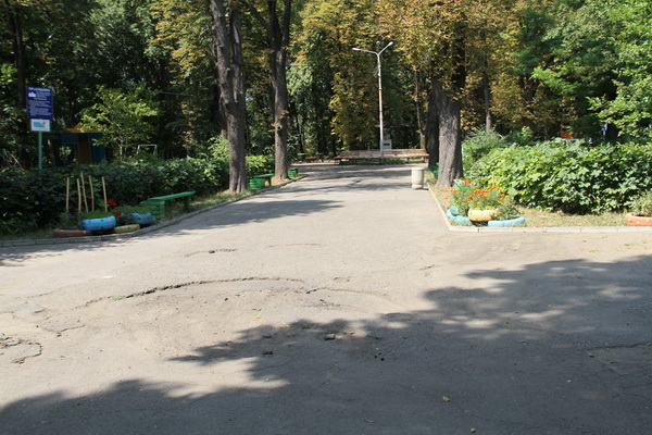 При вході – дитячий майданчик, розмальовані будиночки, в загальному – приємна атмосфера. Проте пішохідні доріжки давно не ремонтувалися. Лавиць для такого парку достатньо, однак вони зовсім незручні для відпочинку: одні з не пошліфованого дерева, інші маленькі, прогнуті чи поламані.