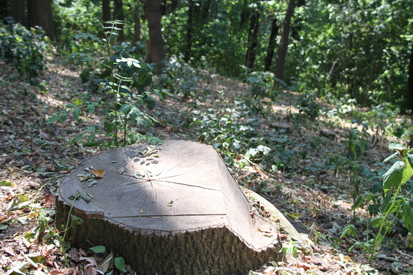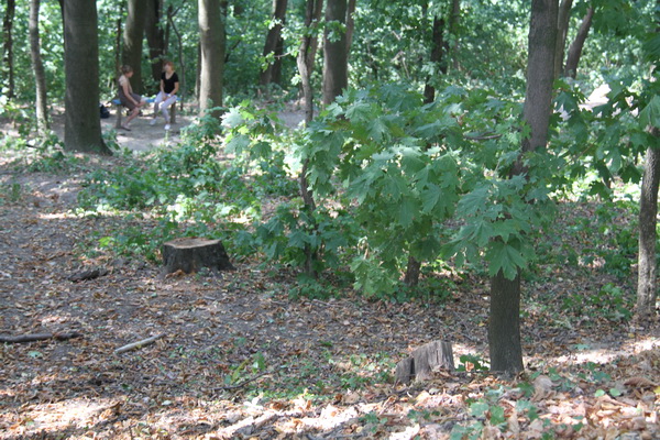Також у парку побачив пні від зрубаних дерев. Деякі з них ще були здоровими, тому не зрозуміло, для чого їх зрізали. Десь просто лежала колода, невпорядкованість території помітна.