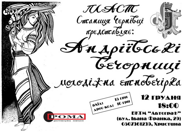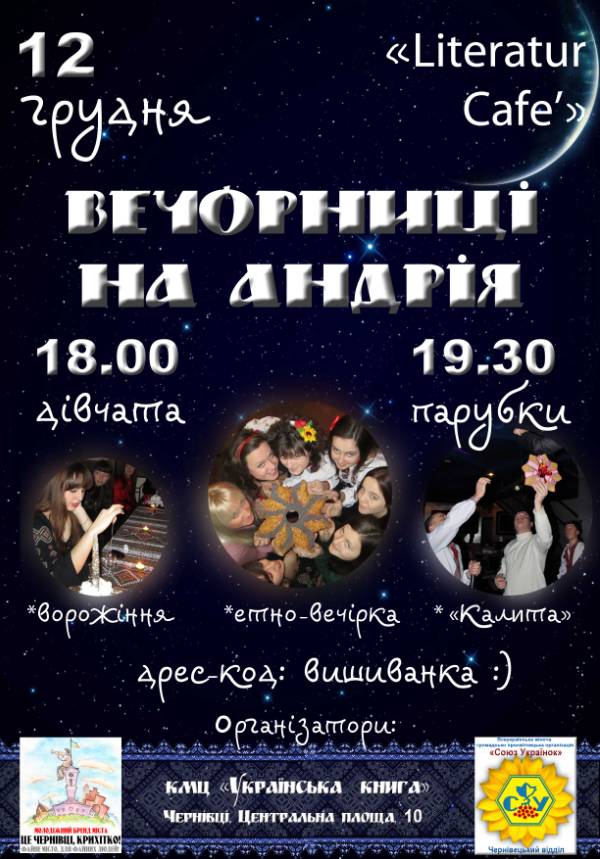 В середу, 12 грудня 2012 року, о 18:00 в БКТМ «Автограф» пластуни проведуть традиційні Андріївські вечорниці, аби відпочити і згадати давні традиції українського народу. У програмі Андріївських вечорниць - відгадування долі (ворожіння для дівчат, для хлопців, спільні), забави, українські танці, смачненькі вареники, нові знайомства і хороший настрій. Тож запрошуємо на святкування. Дрес-код – вишиванка. Вхід для учасників, котрі дотрималися дрес-коду - 10 грн, для інших - 15 грн, - повідомили www.buknews.com.ua у прес-службі Станиці Чернівці НСОУ - ПЛАСТ.
