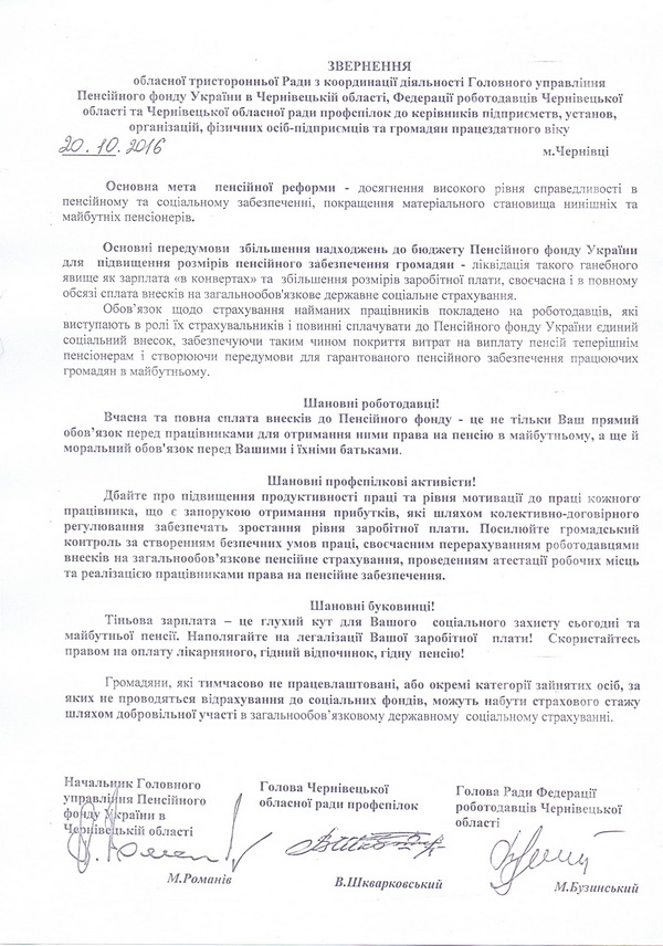 обласної тристоронньої Ради з координації діяльності Головного управління Пенсійного фонду України в Чернівецькій області, Федерації роботодавців Чернівецької області та Чернівецької обласної ради профспілок до керівників підприємств, установ, організацій, фізичних осіб-підприємців та громадян працездатного віку