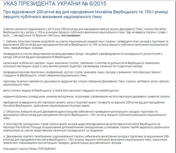 Згідно з підписаним сьогодні Указом Президента України, обласним, Київській міській державним адміністраціям доручено забезпечити проведення регіональних заходів з підготовки та відзначення 200-річчя від дня народження Михайла Вербицького і 150-ї річниці першого публічного виконання національного гімну.