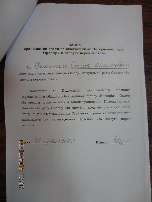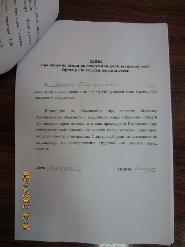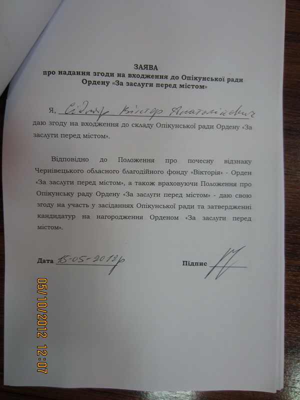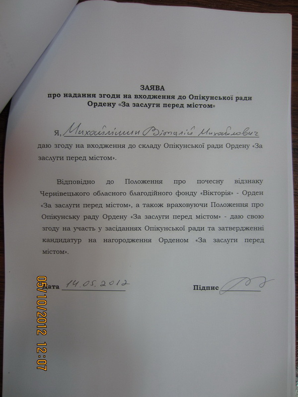 Віталій Михайлішин дав згоду на своє входження до Опікунської ради Ордену пізніше, 14 травня 2012 року (зображення IMG_1839.JPG). А затвердили склад Опікунської ради Ордену 15 травня 2012 року, на загальних зборах благодійного фонду «Вікторія» (зображення IMG_1835.JPG - IMG_1836.JPG).
