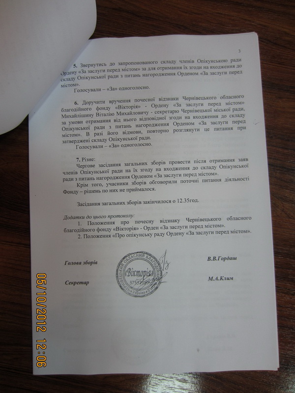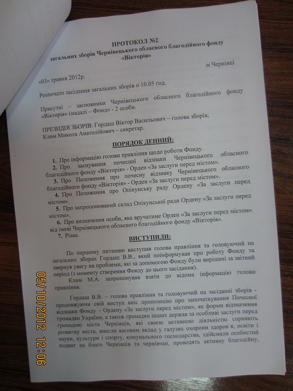 Загальні збори Чернівецького обласного благодійного фонду «Вікторія» відбулися 3 травня 2012 року, вони тривали з 10:05 до 12:35. На зборах були присутні дві особи: Гордаш Віктор Васильович (голова правління Фонду, головуючий на засіданні) та Клим Микола Анатолійович (секретар засідання).