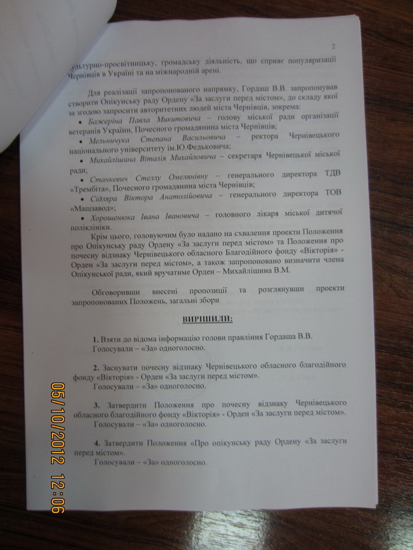 Далі читаємо, що «для реалізації запропонованого напрямку Гордаш В.В. запропонував створити Опікунську раду Ордену «За заслуги перед містом», до складу якої запросити авторитетних людей міста Чернівців».