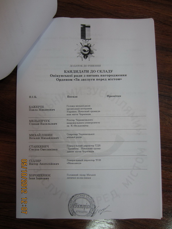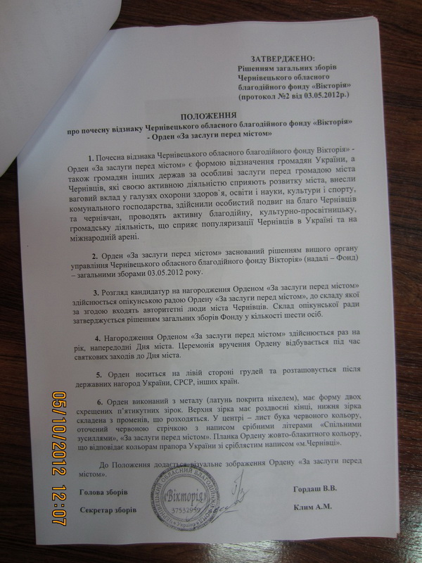 Ще 3 травня 2012 року на своїх загальних зборах (у складі двох осіб) Чернівецький обласний благодійний фонд «Вікторія» заснував почесну відзнаку благодійного фонду «Вікторія» – Орден «За заслуги перед містом». У другій половині вересня 2012 року в ЗМІ з’явилося чимало інформації стосовно цього Ордену, яка не відповідає дійсності і вводить читачів та виборців в оману.