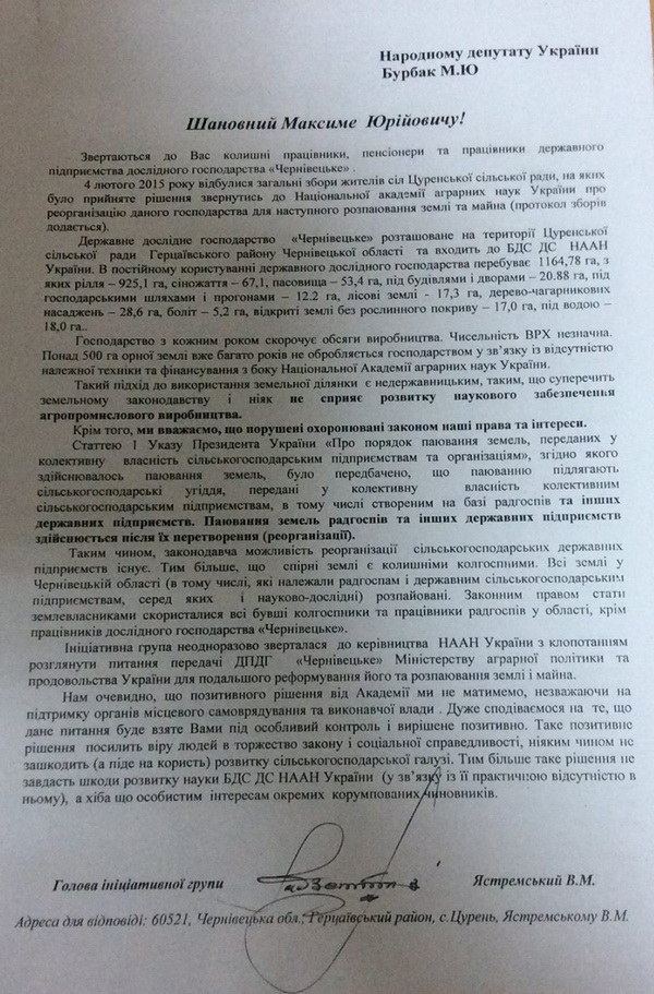 - Цікаві документи отримав під час прийому виборців у м. Герца. В.о. начальника Головного управління Держземагенства у Чернівецькій області Рокицький В.В. повідомляє голові Цуренської сільради про заяву мешканця Львівської області про наміри взяти в оренду на 25 років землі загальною площею понад 460 га, - повідомляє народний депутат України Максим Бурбак. - Ніби-то добре, що ґазда з Львівщини хоче займатись агробізнесом у нас на Буковині.