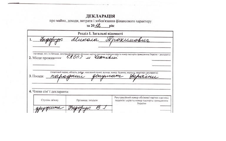 Відповідно до статті 12 Закону України «Про запобігання і протидії корупції» народний депутат України Микола Федорук подав декларацію про майно, доходи, витрати і зобов’язання фінансового характеру за 2012 рік. На відміну від керівників Чернівецької області, які показали лише виклад декларації, нардеп оприлюднив також фотокопії документів.