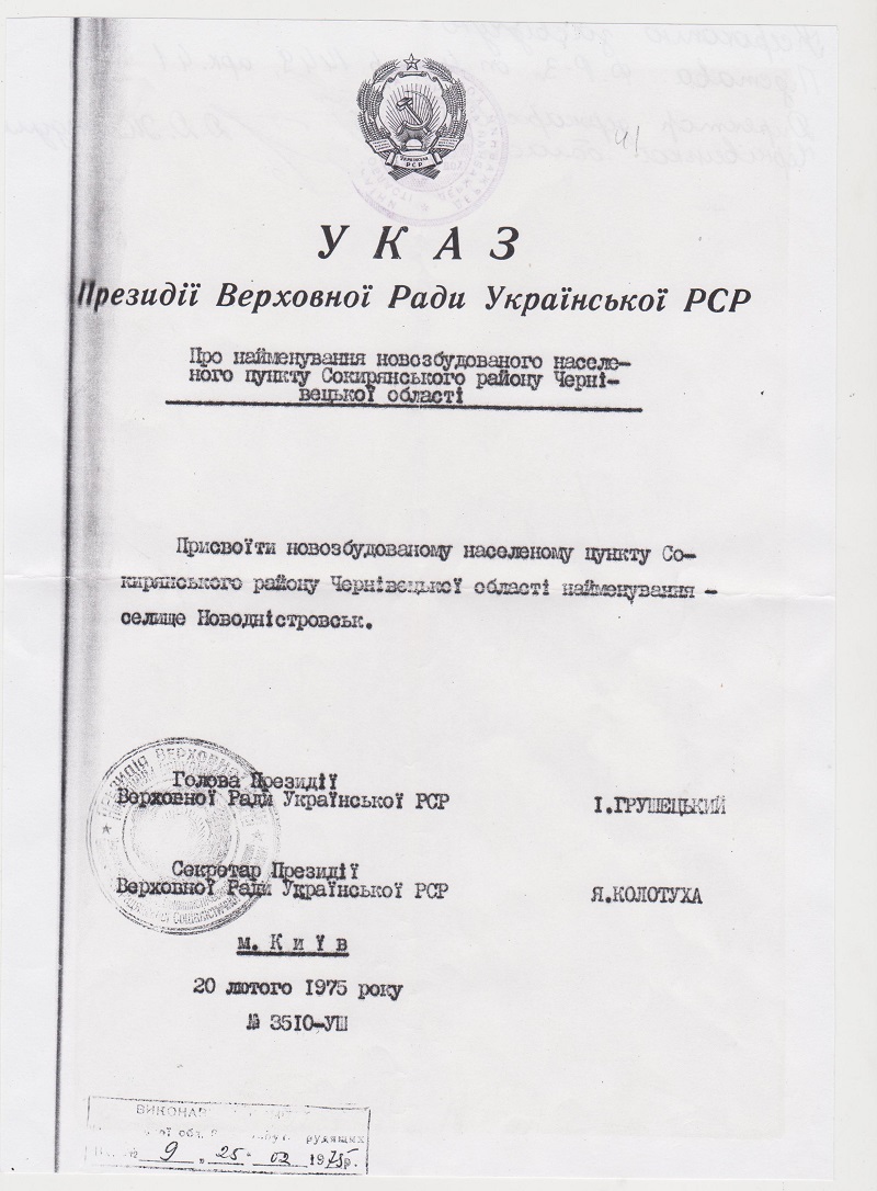 - 2015 рік для Новодністровська в історичному значенні неординарний: минає 40 років із того часу, коли Указом Президії Верховної Ради Української РСР від 20.02.75 р. новозбудованому населеному пункту Сокирянського р-ну Чернівецької обл. присвоєно найменування «Новодністровськ», а рішенням виконкому Чернівецької обласної Ради від 25.02.75 р. за № 57 Новодністровськ включено до облікових даних населених пунктів області та Сокирянського р-ну з віднесенням до категорії селищ міського типу.