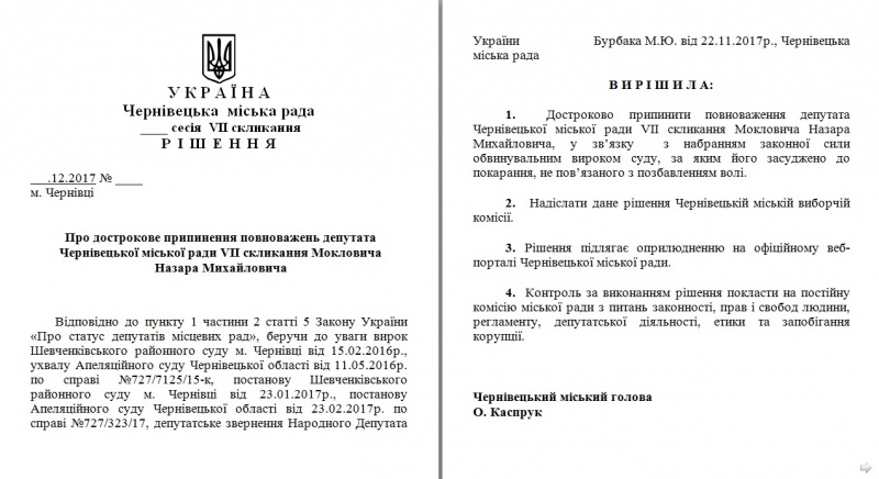 У документі зазначається, що міськраді пропонується достроково припинити повноваження депутата Мокловича у зв’язку з набранням законної сили обвинувальним вироком суду, за яким його засуджено до покарання, не пов’язаного з позбавленням волі.