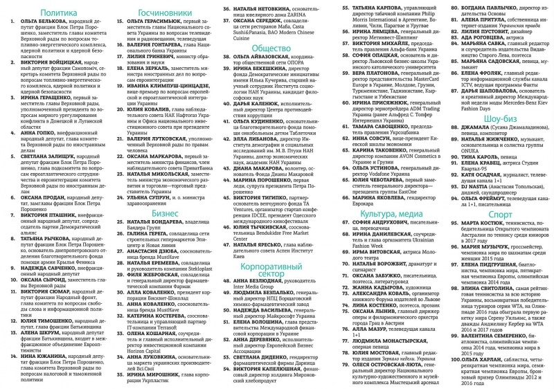 В сотню найуспішніших увійшли жінки, які досягли найбільших кар'єрних успіхів у восьми сферах — політиці, бізнесі, держслужбі, корпоративному секторі, суспільній діяльності, культурі і медіабізнесі, шоу-бізнесі і спорті.