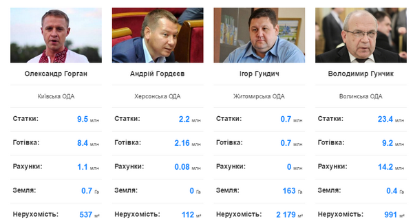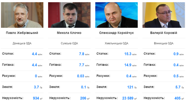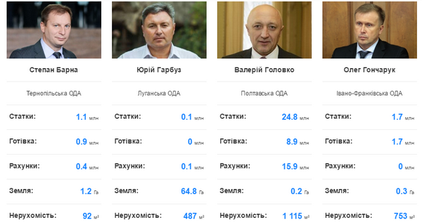 Якщо рахувати у національній валюті, глави обласних держадміністрацій задекларували на всіх близько 800 млн грн.