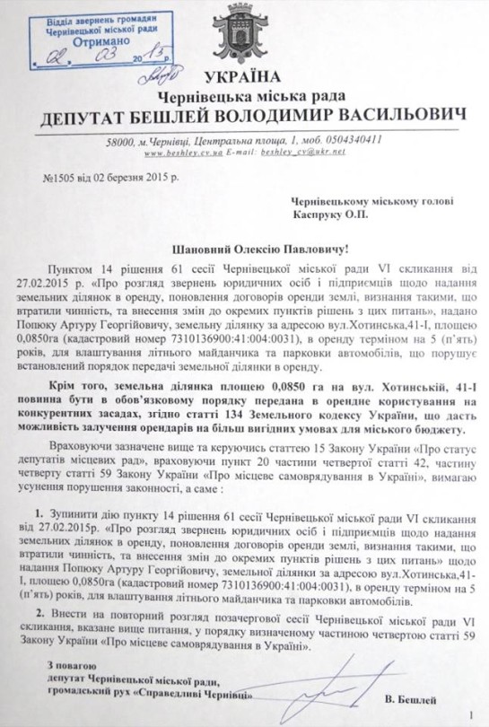 Олексій Каспрук нагадав депутату, що право на набуття в оренду зазначеної земельної ділянки у підприємця виникло ще 26 липня 2012 року на підставі рішення Чернівецької міської ради №575. І це рішення в силу статті 144 Конституції України та статті 73 Закону України «Про місцеве самоврядування в Україні» є обов’язковим до виконання.