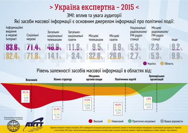 Під час національного експертного опитування виявилось, що лідером серед засобів масової інформації, які були основним джерелом інформації про політичні події як на загальнодержавному (83,6%), так і на регіональному (82,4%) рівні, були інформаційні видання в мережі Інтернет. Друге місце посідають соціальні мережі – 71,4% та 71,8% відповідно. Такі тенденції, вочевидь, пояснюються високим рівнем (89,2%) залежності засобів масової інформації від їхніх власників.