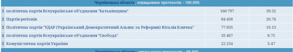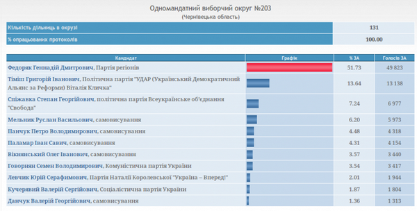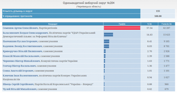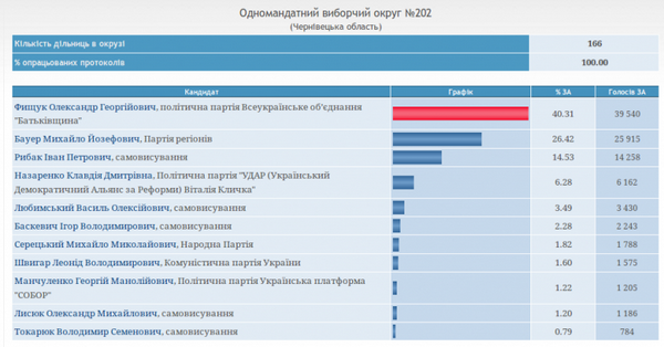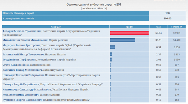 На округах Чернівецької області опрацьовано 100% протоколів. Результати підрахунку голосів на мажоритарних округах: