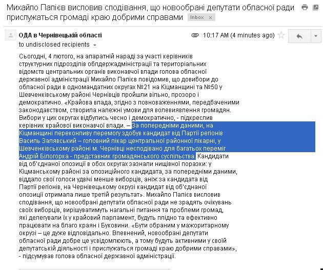 «Крайова влада, згідно з повноваженнями, передбаченими законодавством, створила належні умови для волевиявлення громадян. Вибори у цих округах відбулись чесно і демократично, - підкреслив керівник крайової виконавчої влади. – За попередніми даними, на Кіцманщині переконливу перемогу здобув кандидат від Партії регіонів Василь Залявський – головний лікар центральної районної лікарні, у Шевченківському районі м. Чернівці несподівано для багатьох переміг Андрій Білогорка - представник громадянського суспільства. Кандидати від об’єднаної опозиції в обох округах зазнали нищівної поразки: у Кіцманському районі за опозиційного кандидата, за попередніми даними, віддало свої голоси удвічі менше виборців, аніж за кандидата від Партії регіонів, на Чернівецькому окрузі кандидат від об’єднаної опозиції отримала лише третій результат».