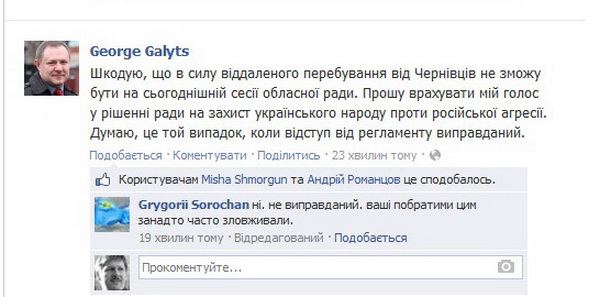 Повідомлення аналогічного змісту у ФБ також залишив колишній перший віце-губернатор Буковини Г.Галиць.