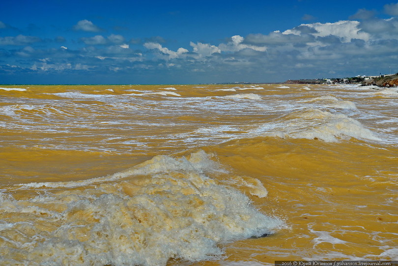 В районі узбережжя Чорного моря у Бахчисарайському районі Криму вода Чорного моря зафарбувалася у жовтий колір через негоду, повідомляє місцевий фотограф Юрій Югансон у своєму блозі в ЖЖ.