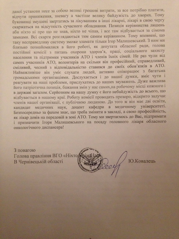 Після учасників АТО, кандидатуру Ігоря Малишевського як в.о. головного лікаря ОКУ «Чернівецький онкодиспансер» підтримали волонтерські і громадські організації воїнів-афганців.