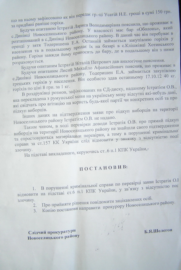 Отримане повідомлення, та відповідна постанова про відмову в порушенні кримінальної справи Новоселицької районної прокуратури, є надумані свідчення зацікавлених осіб, які застосувавши такий метод захисту як і до підозрюваного в підкупі виборців, так і обраному таким чином депутату , що є замовником порушення виборчого права на виборах 28.10.2012.