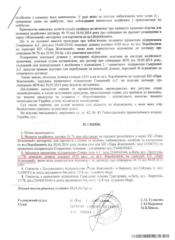 Нарешті, 28 грудня 2015 року, суд визнав недійсним договір про співпрацю з ПП А. Смирновою. Підприємицю зобов'язали звільнити ділянку, якою та користувалась. Рішенням Львівського апеляційного суду в квітні 2016 року ці вимоги були залишені без змін.