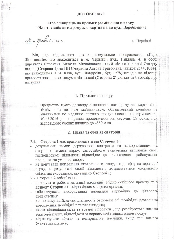 Чернівецький парк “Жовтневий” дивний не тільки тим, що нещодавно депутати міської ради перейменували його на парк Реформації. Він цікавий ще й тим, як там господарюють підприємці. Мова тут йтиме про ПП А.Г. Смирнова. Ця підприємиця, яка зареєстрована в Києві, отримала навесні 2014 року 0,4 га паркової землі від місцевої влади завдяки договору про співпрацю (так-так — про співпрацю, а не оренди!) без конкурсів і погоджень на 39 років (!). Така практика в парку існувала вже давно. За цей час на основі договору про співпрацю на території парку встановлено картинг, зведено багато споруд для відпочинку, альтанок, є стоянка, охорона тощо. Одним словом — такий собі відпочинковий комплекс, назва якому досить красномовна “Халабуда”.