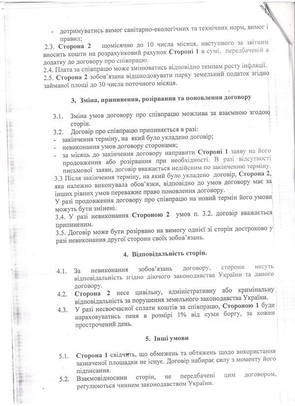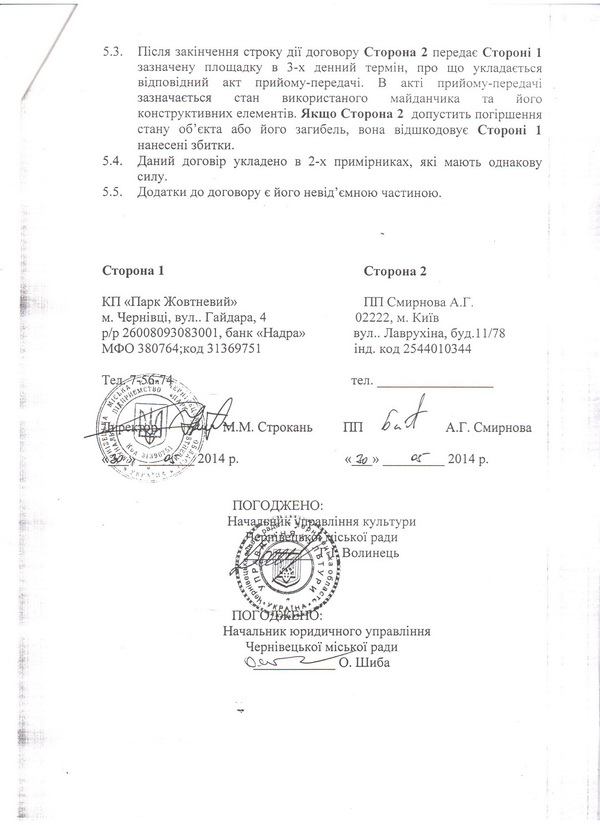 До слова, на території парку функціонують на підставі договорів про співпрацю ще зо два десятка торгових об’єктів та об’єктів розваг. Вони теж можуть скористатись (а може й скористались) ноу-хау ПП А. Смирнова і почати вирубувати дерева, будувати альтанки, провадити бізнес без правових підстав. Ситуація ж дозволяє.