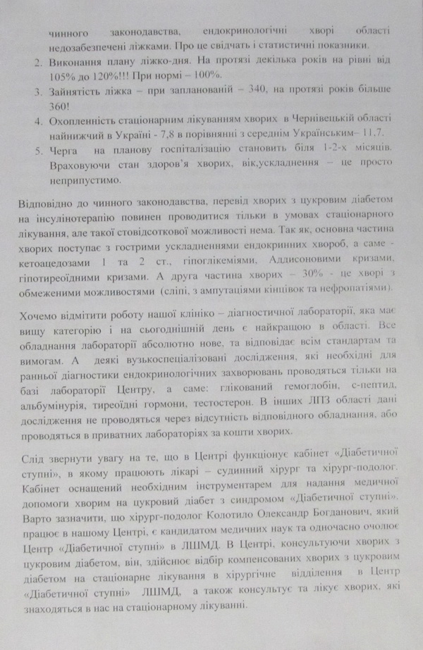 Найвагомішим аргументом на користь існування цілісного спеціалізованого центру є тенденція до зростання кількості хворих на цукровий діабет, яку фіксують в області. Загальна кількість ендокринологічно хворих на Буковині сягнула 80 тисяч осіб. Усі ці люди потребують комплексного, спеціального лікування, забезпечити яке може лише вузько спеціалізована лікувальна установа. І все необхідне для допомоги хворим в центрі є – стаціонарне відділення, найкраща в області клініко-діагностична лабораторія тощо.