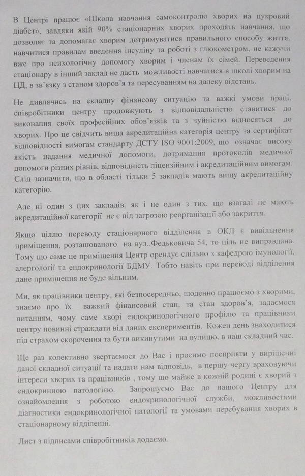 Про це, а також фактичне нехтування інтересами хворих на діабет говорили учасники сьогоднішнього зібрання. Зокрема, виступаючих обурило телевізійне інтерв’ю заступника директора департаменту охорони здоров’я Марії Поліщук, яка розмірковувала про чергову реорганізацію центру. Хоча, за словами пристуніх на зборах, жодного разу його не відвідала. Щобільше навіть переплутала назву називаючи центр диспансером.