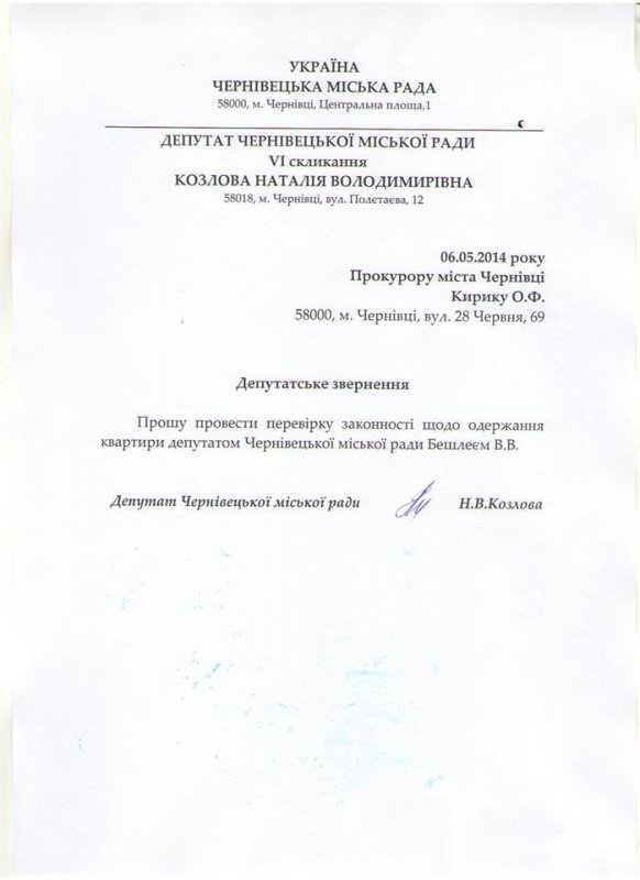 "Прошу провести перевірку законності щодо одержання квартири депутатом Чернівецької міської ради Бешлеєм В.В.", - йдеться у зверненні.
