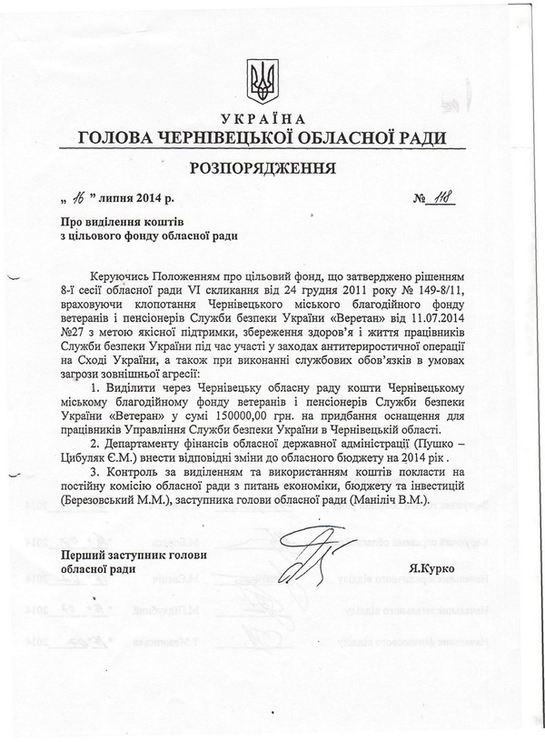 Прокурор Чернівецької області Микола Якимчук повідомив, що правоохоронці перевіряють інформацію про нібито одноосібне розпорядження коштами з обласного бюджету першим заступником голови обласної ради Ярославом Курком. Про це заступник голови облради Валентин Маніліч заявив на прес-конференції 27.01.2015. Зокрема посадовець місцевого самоврдяування тоді сказав, що Ярослав Курко ще в липні 2014 року нібито прийняв одноосібне рішення щодо перерахування 150 тисяч гривень на користь благодійного фонду "Чернівецький міський благодійний фонд ветеранів і пенсіонерів Служби безпеки "Ветеран".
