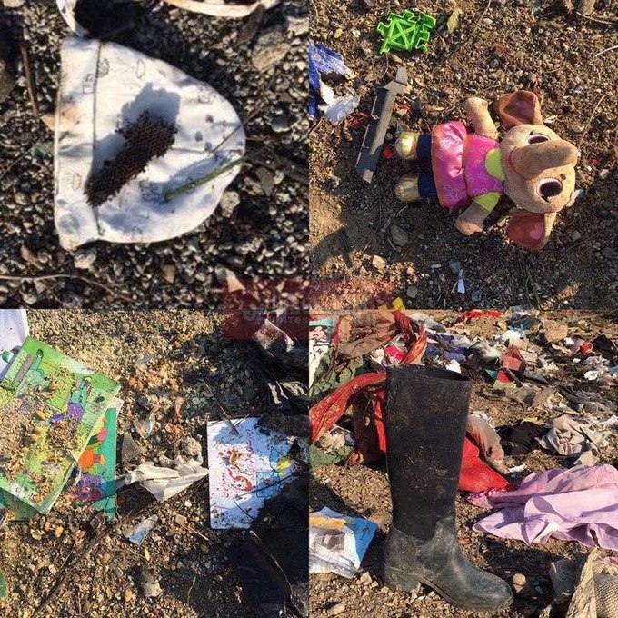"Знайдені дитячі речі пасажирів на місці аварії літака під Тегераном", - написали в мережі і опублікували фото.