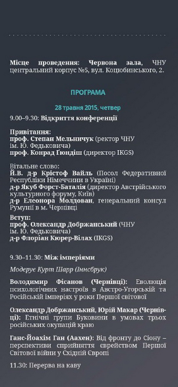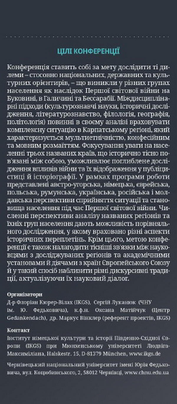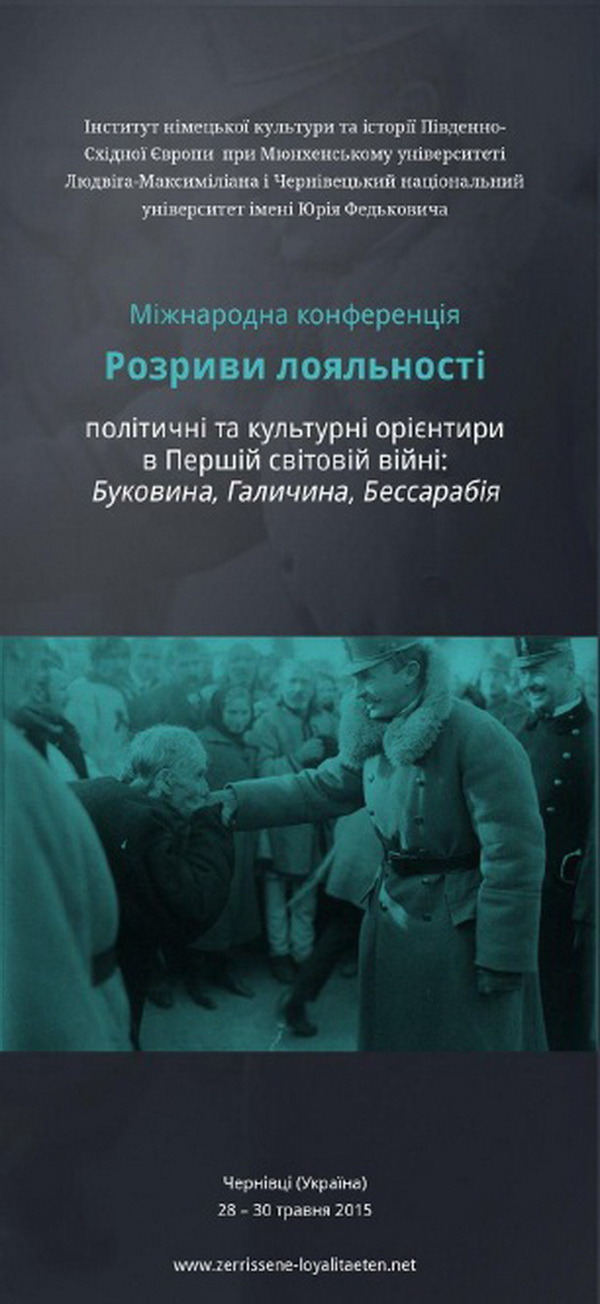 28 – 30 травня 2015 року у Чернівцях відбудеться триденна міжнародна наукова конференція «Розриви лояльності: політичні та культурні орієнтири в Першій світовій війні – Буковина, Галичина, Бессарабія» за участю науковців з країн Європи.