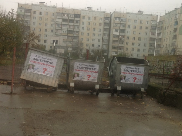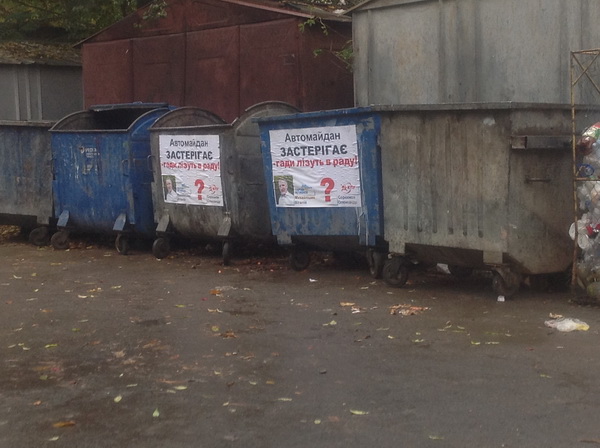 У супровідному листі до фотографій йшлося про таке: "Провокації продовжуються...... Автомайдан хотять звинуватити у чорному піарі. Нові плакати були помічені по вулицях: головній, гайдара, стасюка, коперника, проспекту незалежності, південно кільцевій, героїв майдану, небесної сотні, бульвар героїв сталінграду, ентузіастів. Очеведці розповідають про десятки нових плакатів щоночі. Брудні технології чи чергова спроба пропіаритись? Була навіть помічена патрульна машина, яка патрулювала район розклейки...."