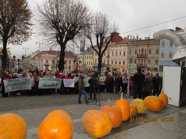 Припинити газовий шантаж Фірташа і врятувати місто від "смотрящого" Продана вимагали під ратушею чернівчани з газовою колонкою і гарбузами (відео+фото)