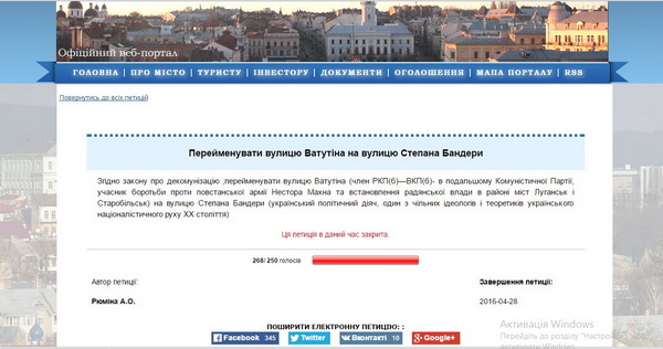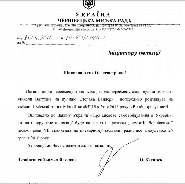 - Робота триває. Петиція щодо перейменування вул.Ватутіна на вул.Степана Бандери на сайті міськради була лиш першим кроком. Далі був розгляд на топонімічній комісії - складний, з суперечками і та безліччю виступів. А тепер ще один крок - розгляд питання на засіданні міськради. Приєднуйтесь, підтримуйте, приходьте! Вулиці С.Бандери в Чернівцях - бути!