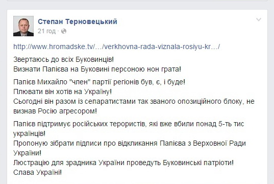 Рухівець закликав визнати Папієва, для якого Росія - це країна, що забезпечує нашу життєдіяльність, персоною нон грата на Буковині!